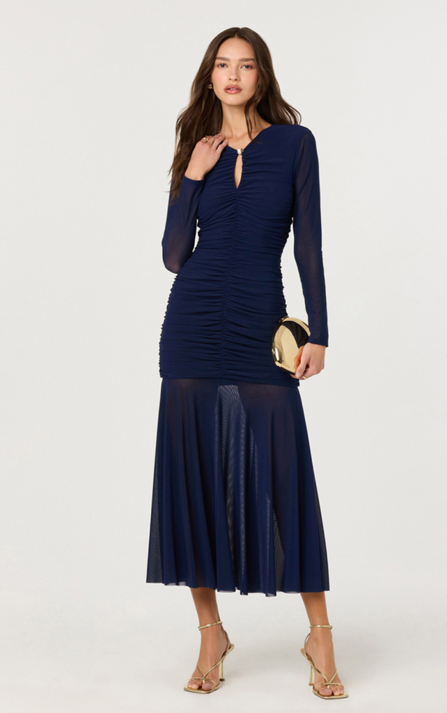 Long sleeve, ruched dress. V-neckline with keyhole cutout. Midi length dress that's lined through...