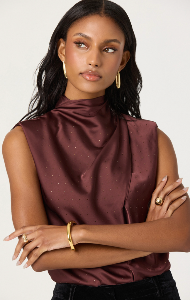 Satin, rhinestone embellished top with crossover, mock neckline. Tie at the top back for an easy ...