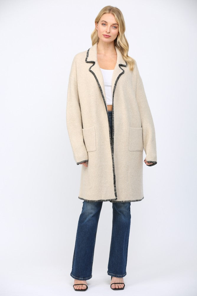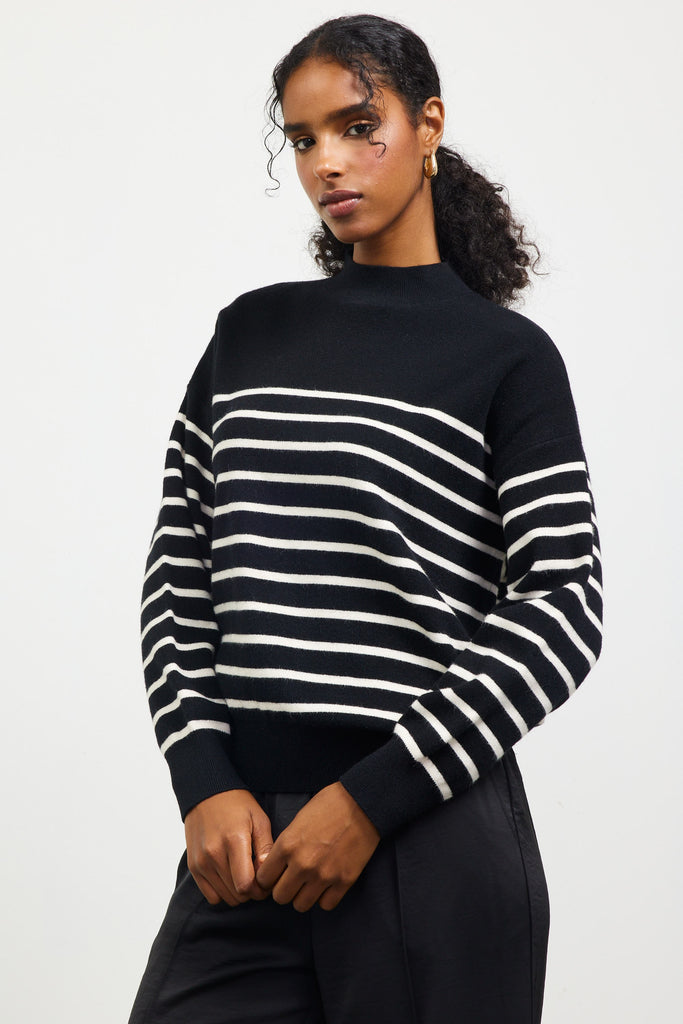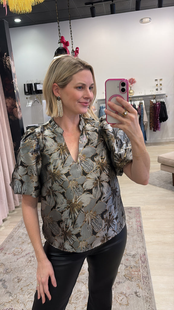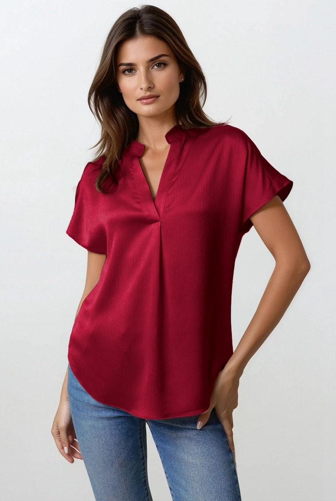 Mardarin collar, faux wrap neck top with flouncy sleeves and keyhole button at the top back.