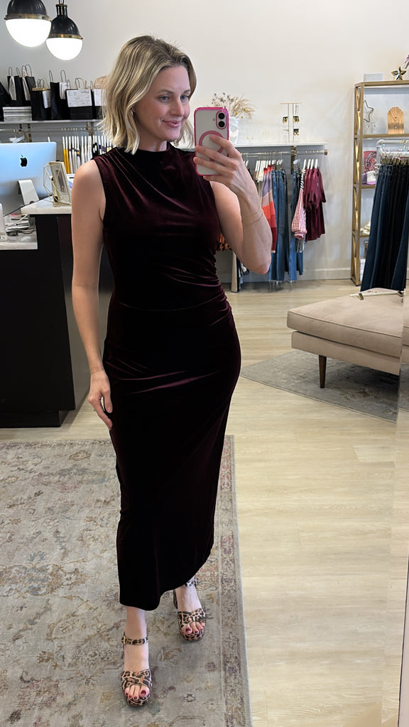 Stretchy, velvet dress with mock neck and draped front and ruched side. Hidden back zipper and sl...