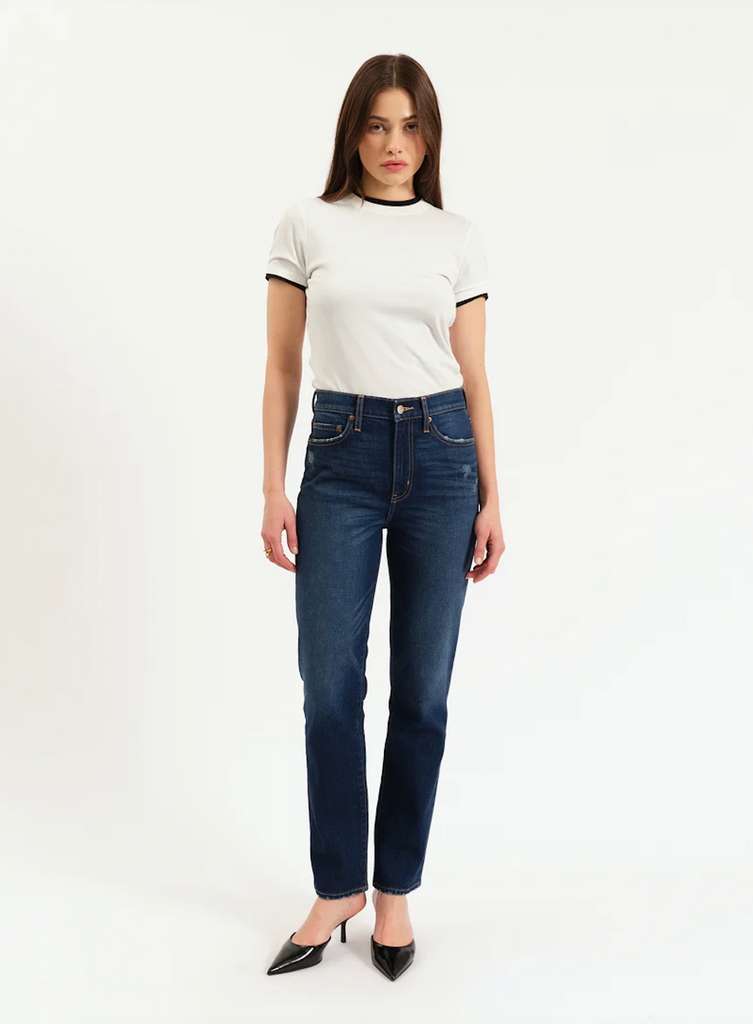 High rise, slim straight leg jeans in a deep blue, clean wash.
