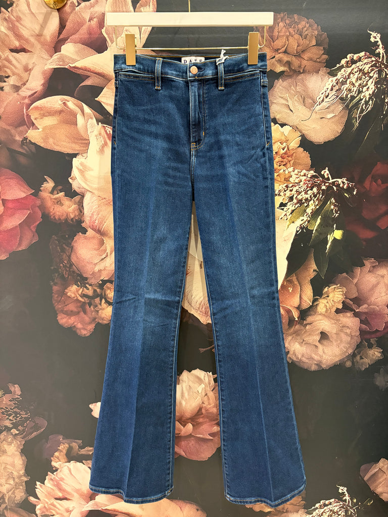 High rise, flare leg denim. Rich, indigo wash with front welt pockets. Constructed from Daze's st...