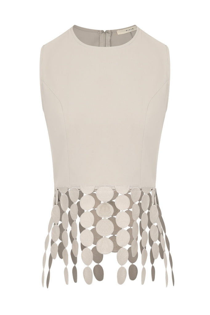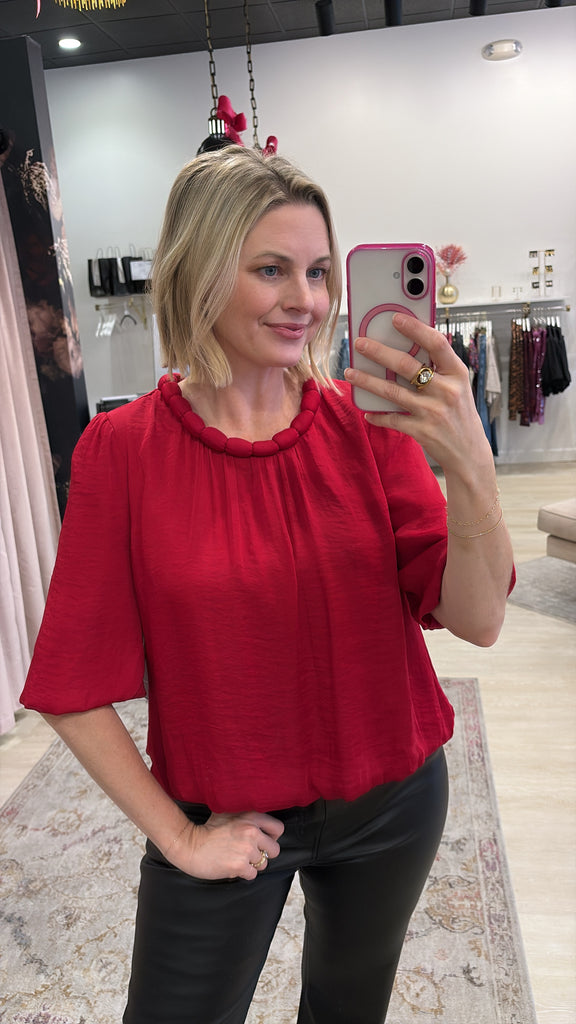 Silky, billowy blouse with braided neckline and relaxed bubble hem. Fully lined for a polished dr...
