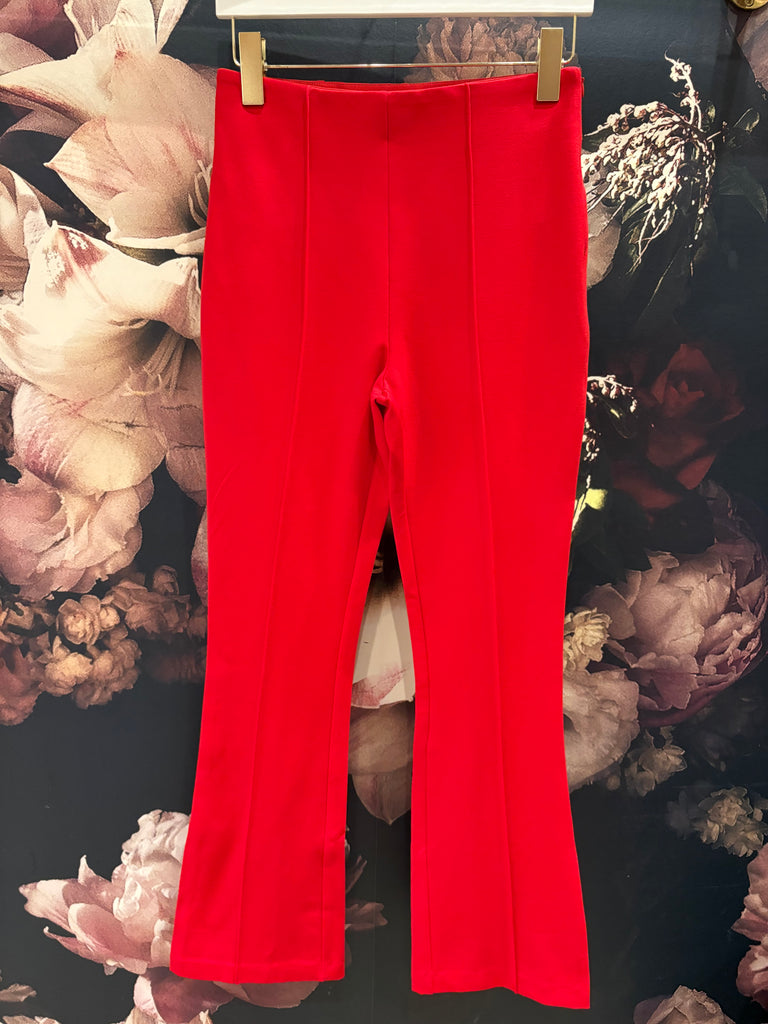 Pointe flare, cropped pants. Center seam down the front and back. Side zipper. Elastic waist.