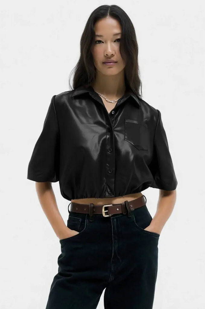 Faux leather, button down, cropped top. Half bubble sleeves and elastic waist.
