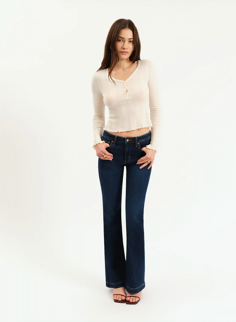 Mid rise, long flare jeans from DAZE. Classic dark wash.
