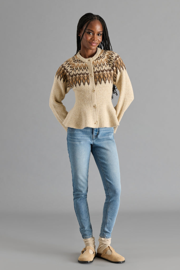 Mardarin collar, faux wrap neck top with flouncy sleeves and keyhole button at the top back.